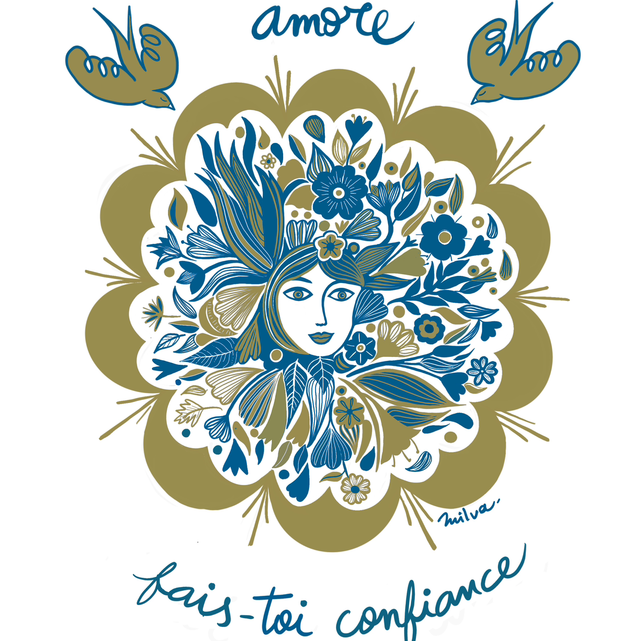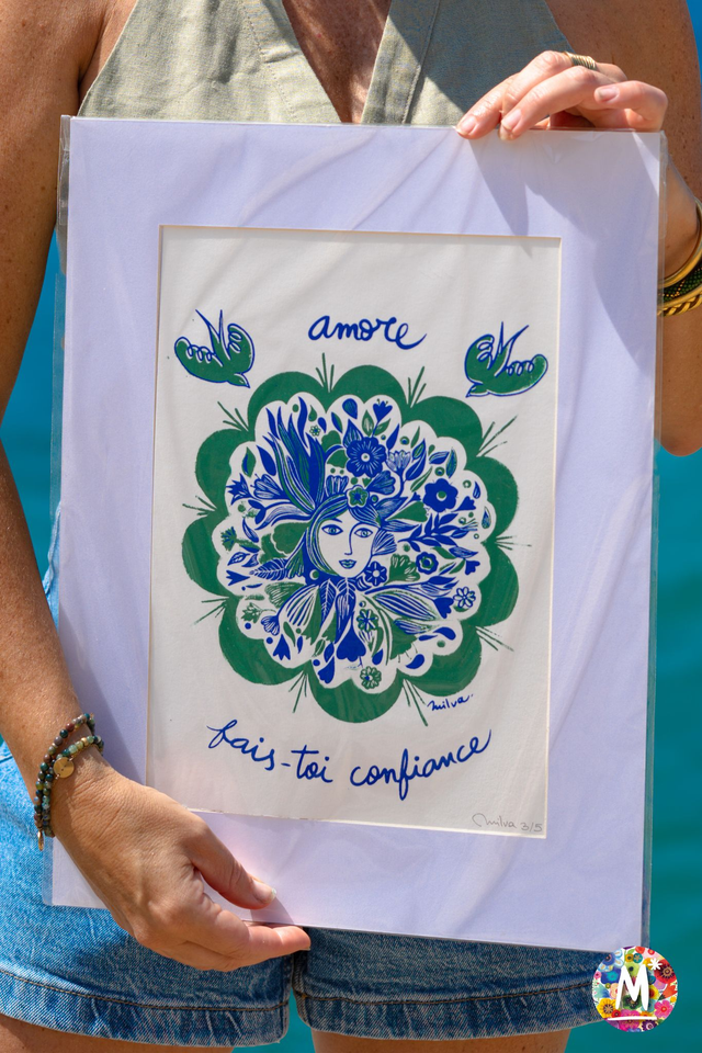 Imprimee en sérigraphie deux couleurs sur un papier de très haute qualité. Pièce unique signée et numérotée.